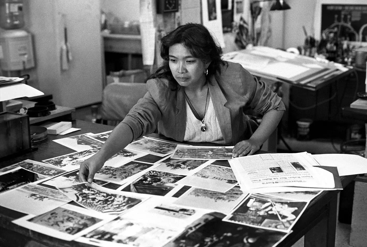 Linda Mabalot was the beloved Executive Director of Visual Communications from the mid-’80s until her passing in 2003. Here, she looks through images to be included in the organization’s 1984 large-scale photo exhibit PLANTING ROOTS: FILIPINOS IN CALIFORNIA.