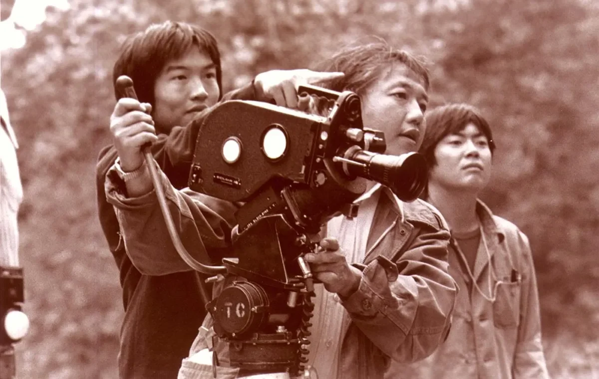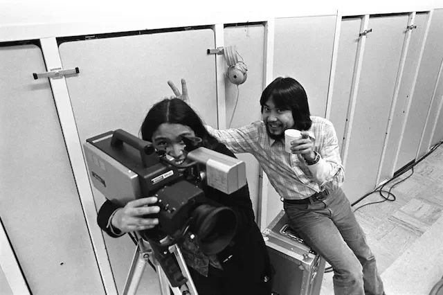 As project director Alan Kondo looks on, VC Founders Eddie Wong and Robert Nakamura line up a shot while on a location shoot in Los Angeles’ Griffith Park. The Éclair NPR, a heavy-duty 16mm camera that was standard-issue equipment from UCLA Film School, was a mainstay of many of VC’s pioneering motion picture documentaries throughout the 1970s and early 1980s.