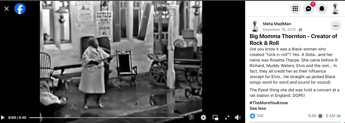 In 2015, I stumbled upon footage of a woman named Big Momma Thornton playing an electric guitar in Europe in the train station. She created the style of music folks now call rock-n-roll. Thornton would have been erased completely had it not been for the footage of her playing and singing the songs she wrote (songs taken from her by racist record executives and given to Elvis Presley, crowning him the King and creator of Rock-n-Roll). She has no plaque or place in the Rock and Roll Hall of fame.