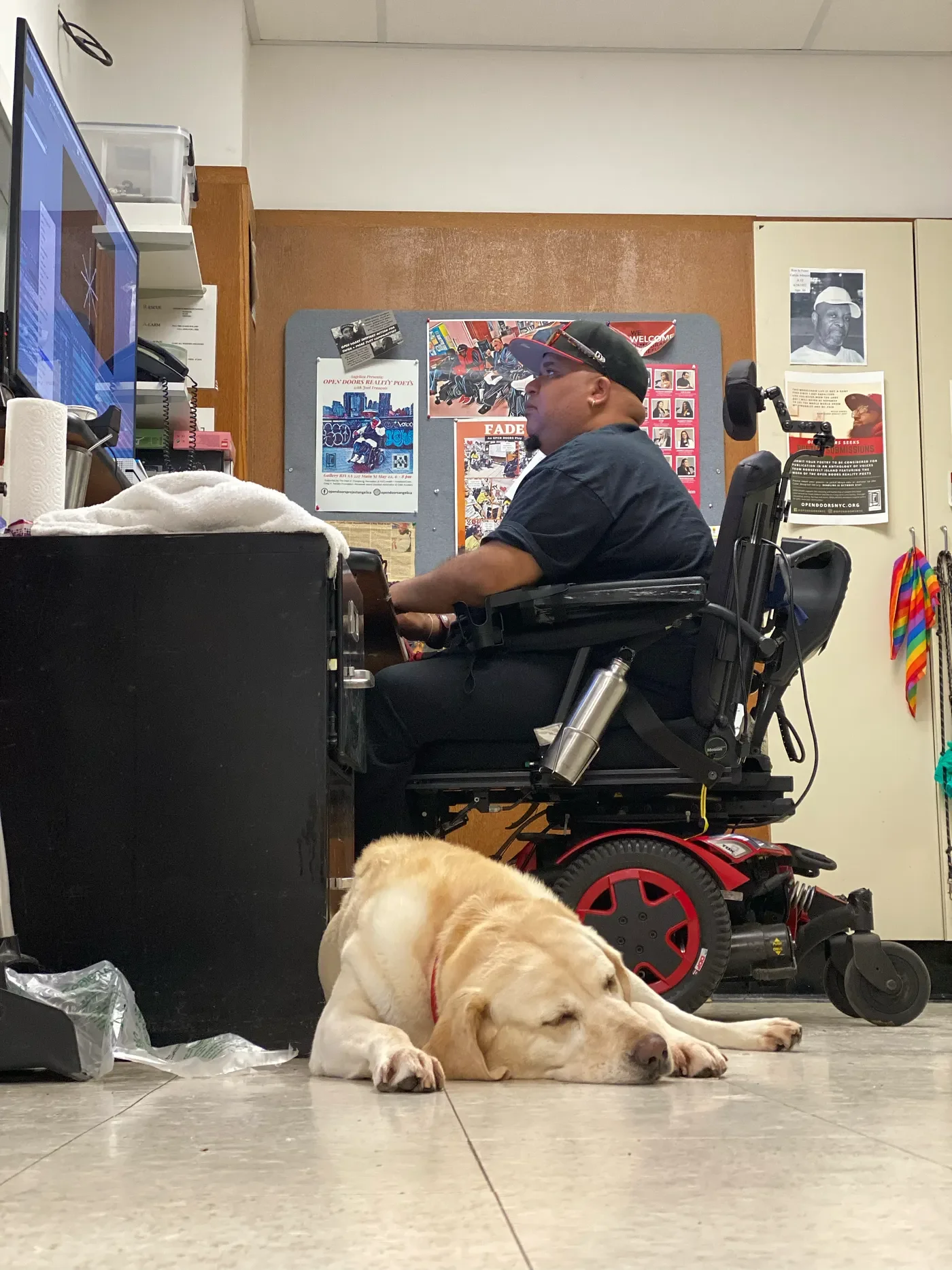Reality Poet Andres Jay Molina, in a black and red Chicago Bulls t-shirt, baseball cap, matching sneakers and face mask, sits in his motorized chair outside with the sweet yellow Labrador Momo.