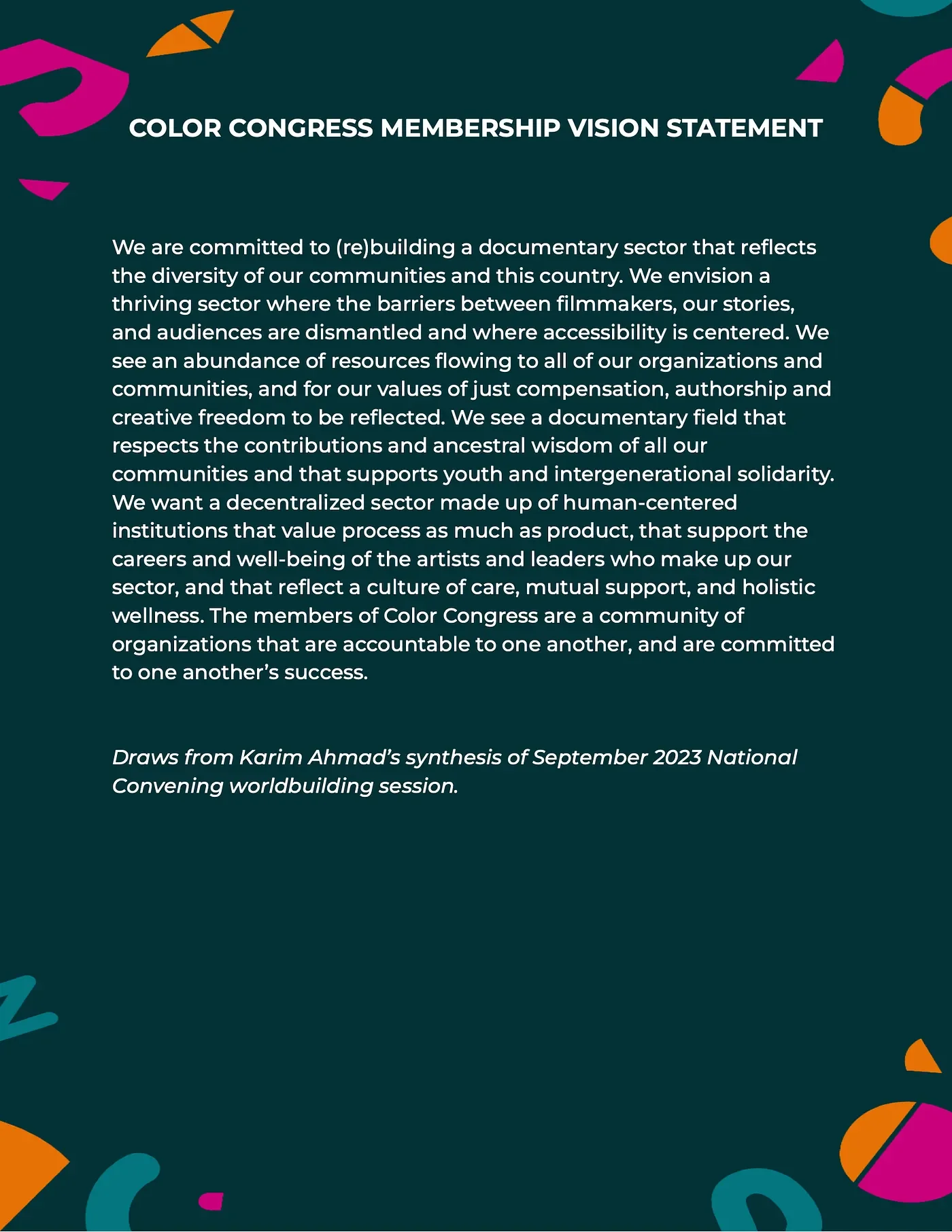 As a membership organized first and foremost around solidarity across differences, we at Color Congress are committed to each other and to understanding the various ways we navigate a status quo that was not designed to serve us. We fearlessly examine harm while attending to differential impacts on our communities, and we boldly advance solutions we believe will benefit us all. We are committed to each other because we believe in this ecosystem’s capacity to tell the truth about our communities and lived realities. And because we believe our stories belong in the world and we know this ecosystem will deliver where a mainstream media system has not. Because we believe storytelling that emerges from a community and culture of care and collective liberation contributes to narratives of collective liberation that ripple outward and fundamentally shift society. But we–all of the cultural organizers, champions of nonfiction storytelling within this ecosystem and the nonfiction sector more broadly–can only do this if we are clear-eyed in our analysis of this moment, how we arrived here, and direct our anger not at each other but at those in power who are responsible for creating the material conditions we wish to change.