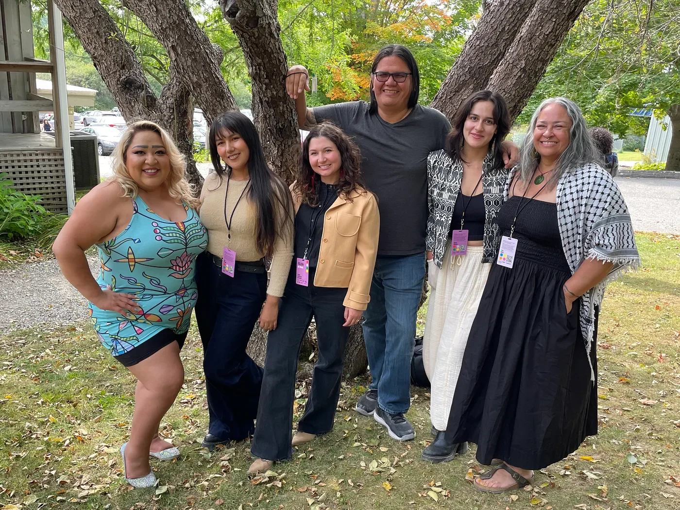 The 2024 4th World Media Lab Fellows at CIFF stand in front of a beautiful tree, from left to right: Kansas Begaye, Sisa Quispe, Cass Gardiner, Bruce Thomas Miller, Victoria Cheyenne, and founder Tracy Rector. Photo by the author.
