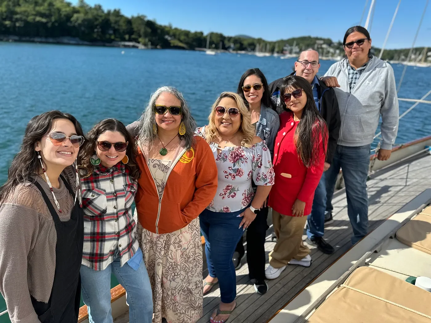 Fourth World fellows and friends take a sail on the deep blue Penobscot Bay in Camden, Maine. Pictured left to right are: Victoria Cheyenne, Cass Gardiner, Tracy Rector, Kansas Begaye, Jannet Nuñes, Sisa Quispe, Chris Newell, and Bruce Thomas Miller. Photo courtesy of Josh Povak and the Points North Institute.